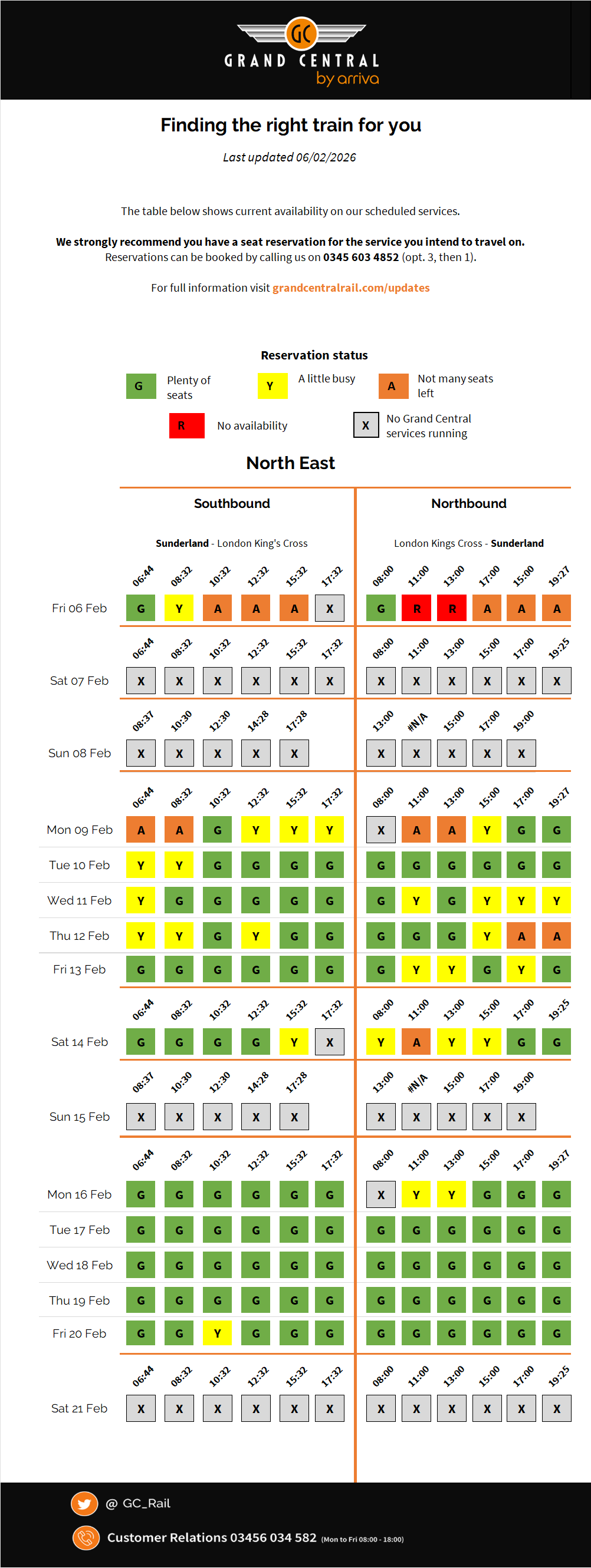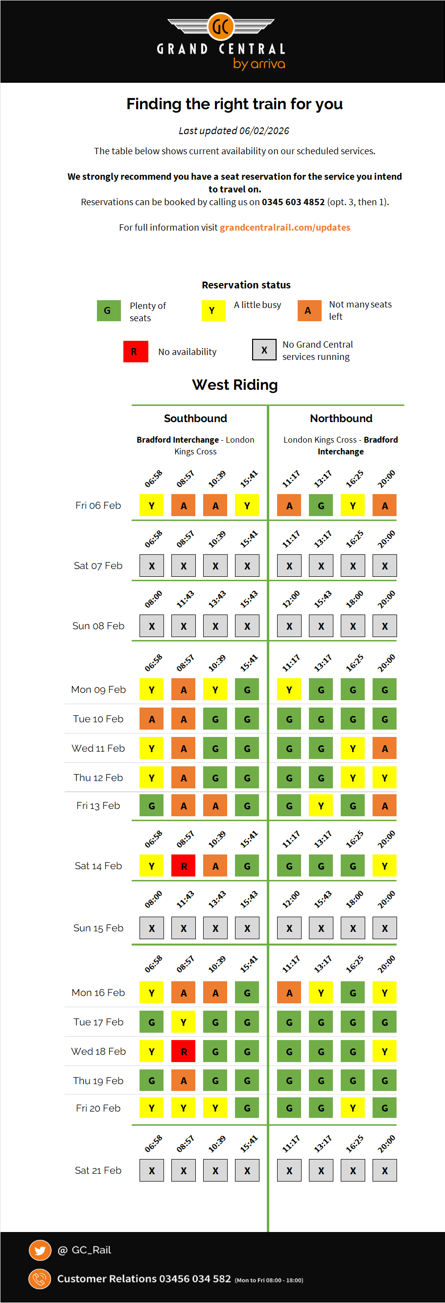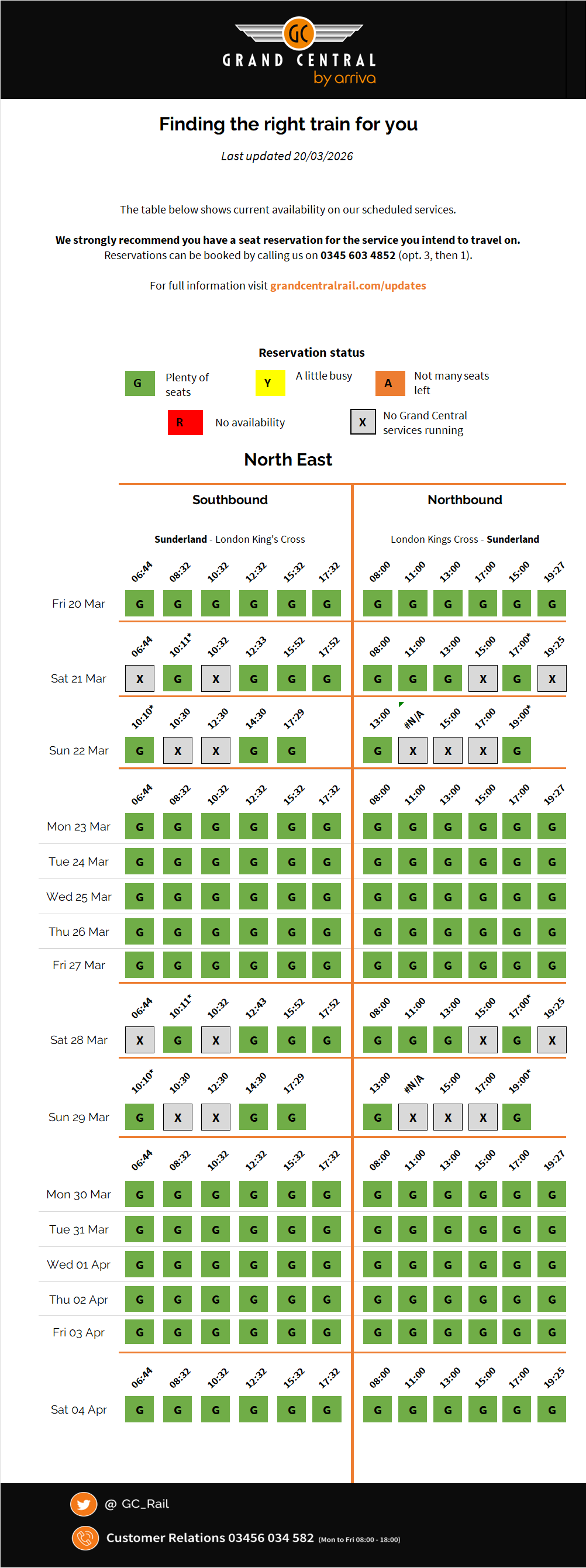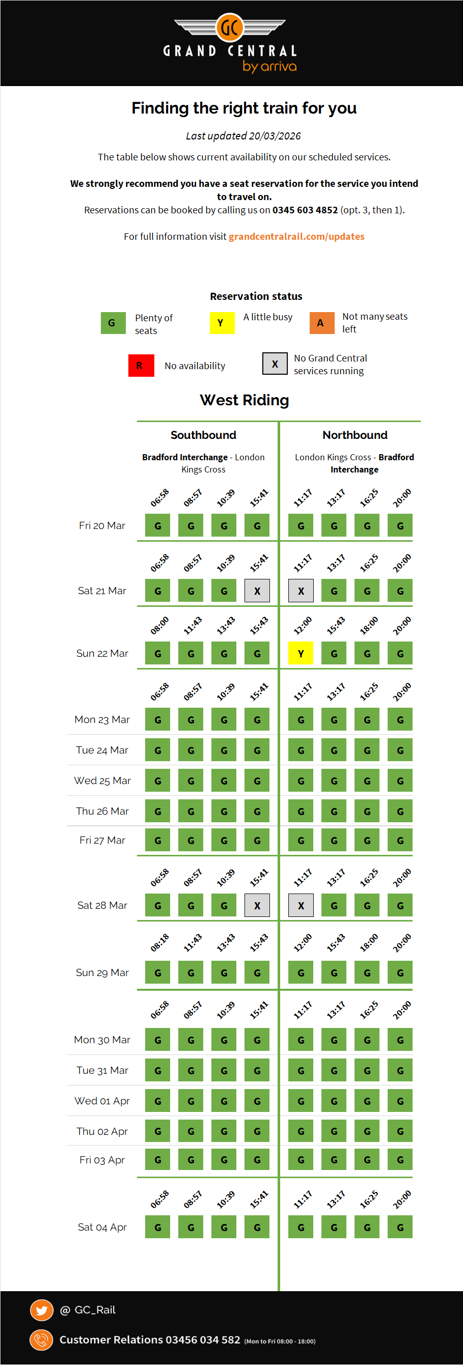 We want you to feel relaxed and comfortable when you travel with Grand Central, so we always strongly recommend that you make a seat reservation before travelling with us. Advance tickets come with a mandatory seat reservation so you don't need to worry about making a reservation. To find out if you need to make a seat reservation, and to make one, just give us a call on 0345 603 4852 (opt. 4, then 1). We post regular updates showing which of our services are the quietest. Simply view the seat availability updates above for more information.